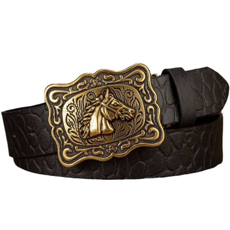 This black western belt for women features a classic cowgirl style with intricate country-inspired designs, showcasing the authentic look associated with the Wild West. Made from faux leather, it is an essential accessory for equestrian enthusiasts and those who appreciate cowboy culture.