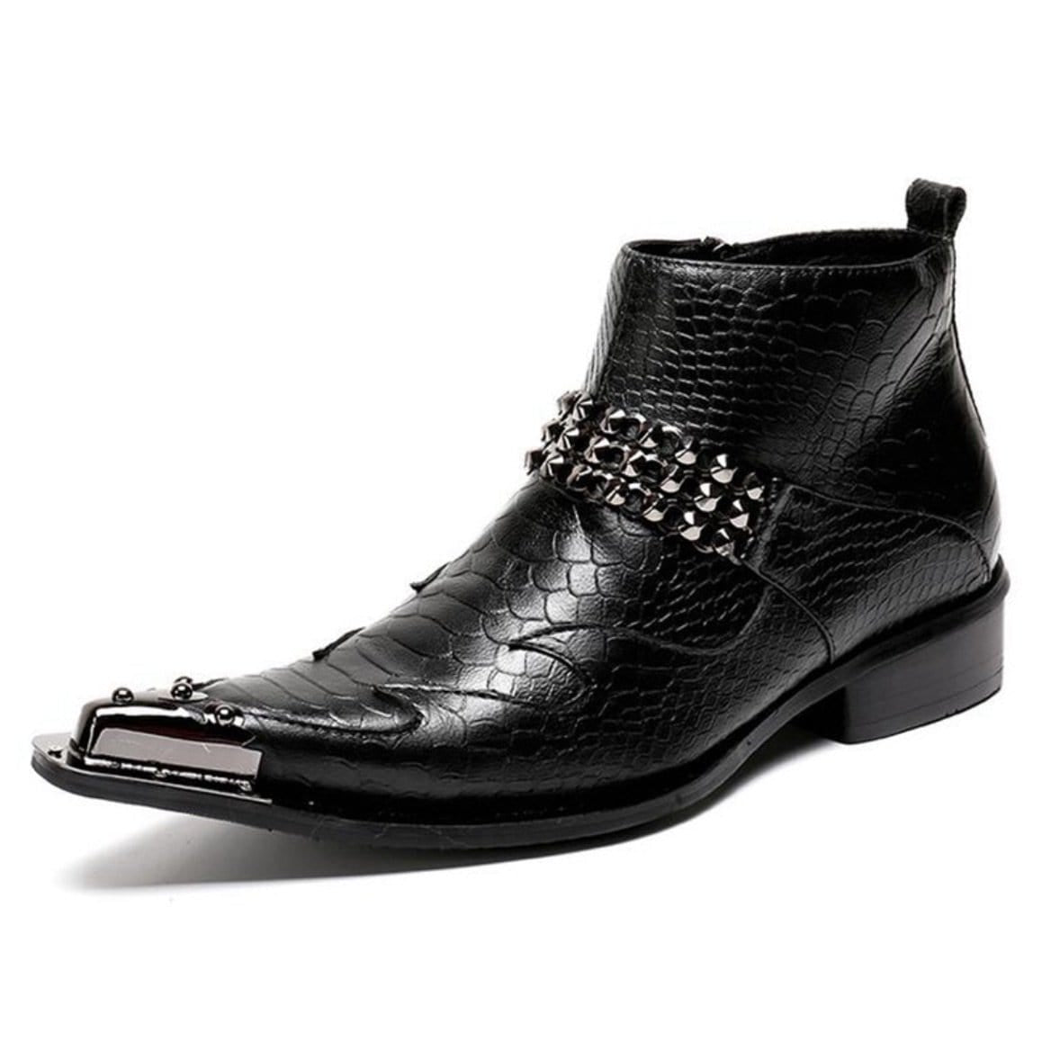 The black cowboy boots feature intricate embossed designs and are crafted from genuine leather with a snake-skin effect. They are handmade, showcasing exceptional attention to detail.
