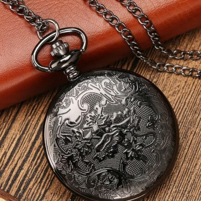 This black pocket watch is made from durable stainless steel and features detailed engravings along with a visible working mechanism. Its vintage design makes it an excellent choice for everyday wear or as a thoughtful gift for enthusiasts of classic timepieces.