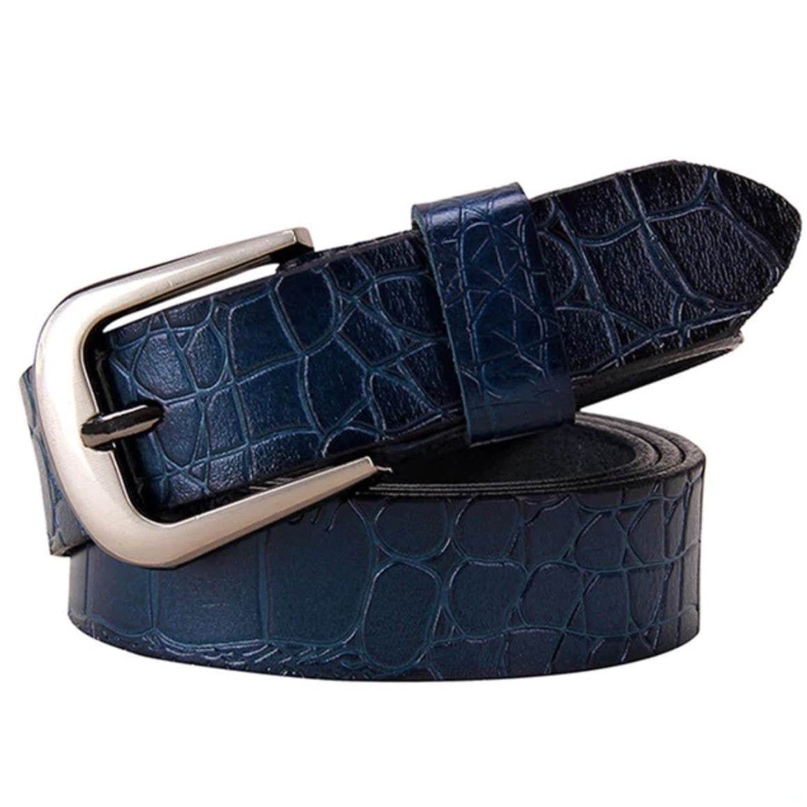 The blue cowboy belt for women is a classic piece from the country-western style. Made from high-quality genuine leather, it features a crocodile-embossed finish that adds a touch of sophistication. This belt is ideal for everyday wear or as a stylish gift for those who appreciate country aesthetics.