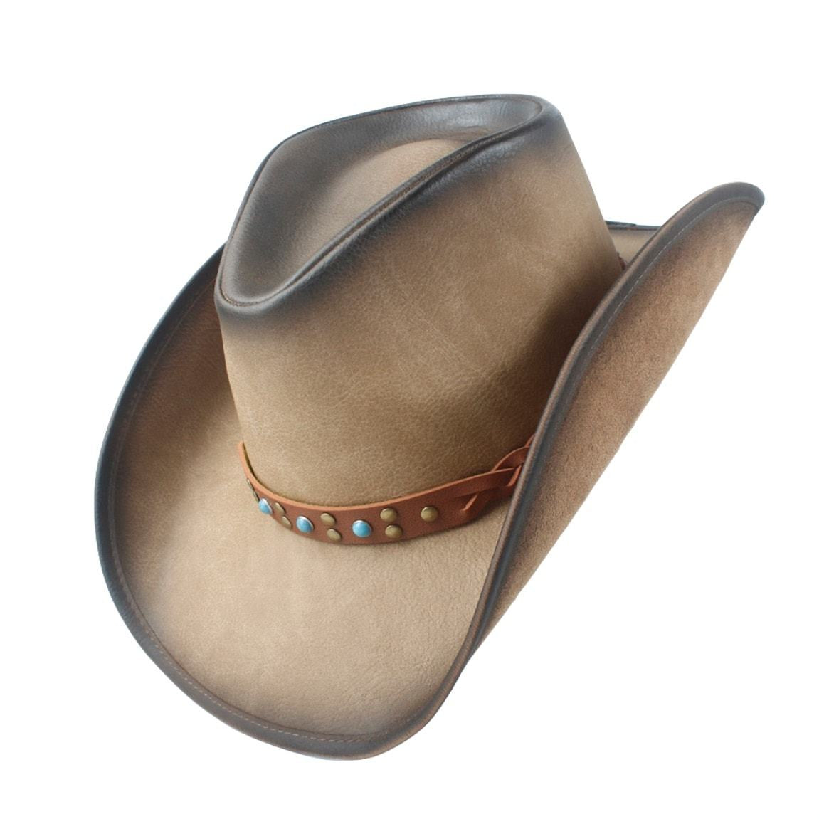 The camel cowboy hat is a distinctive element of western attire. Made from high-quality genuine leather, it features a decorative strap for a unique feminine style.