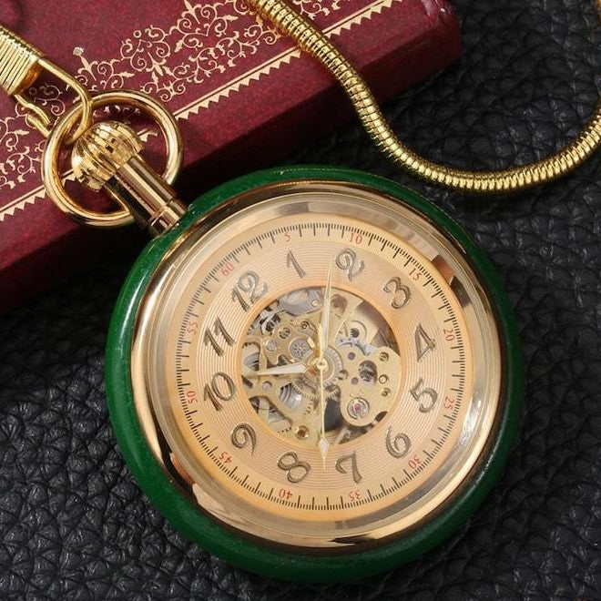 This pocket watch is crafted from robust stainless steel and features a striking jade hue. Its distinctive western design sets it apart, making it an excellent choice for both everyday wear and as a thoughtful gift.