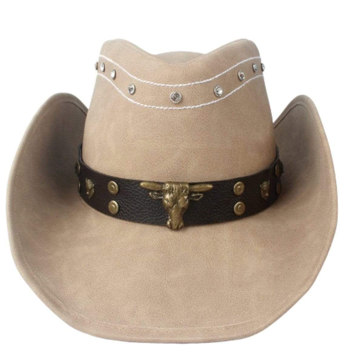 This Comanchero leather hat features a light colour and a distinctive buffalo skull band, making it a standout piece for western enthusiasts.