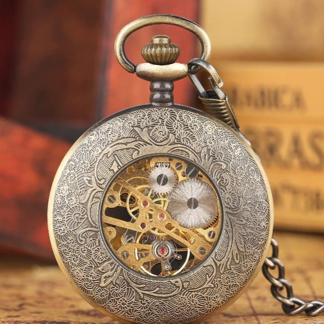 This pocket watch features a unique floral engraving and is made from robust stainless steel, ensuring durability. Its sophisticated design makes it a striking accessory for both everyday wear and special occasions.