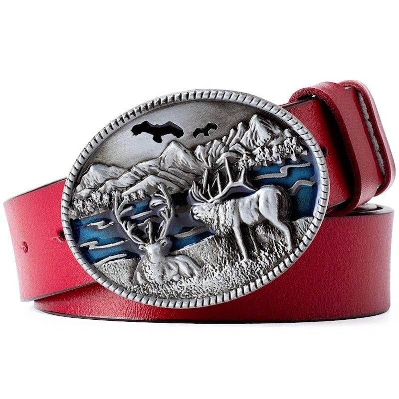 This striking red western belt features a deer motif, appealing to enthusiasts of cowboy culture. Its unique and refined finish showcases the essence of the American Wild West and its vast landscapes. Made with exceptional attention to detail, this belt is a true reflection of western style.