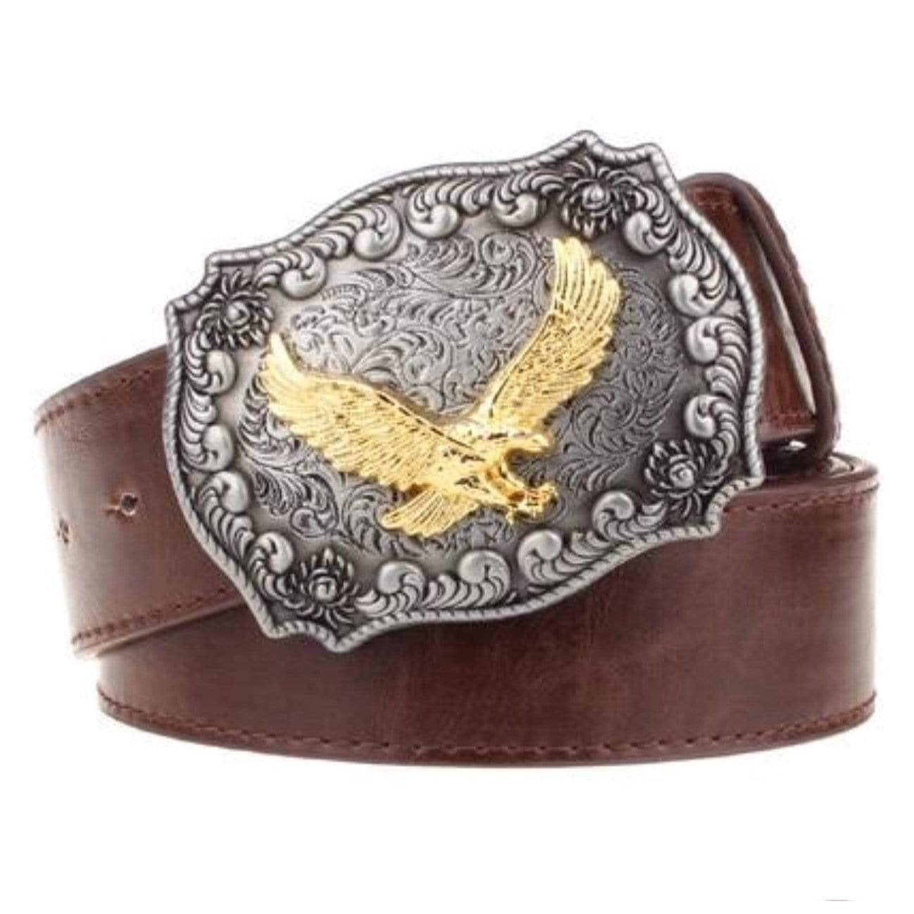 The Cowboys Shop presents a striking eagle belt, featuring a detailed eagle engraving that draws inspiration from the American Wild West. This unique design showcases the iconic bald eagle, the national bird of the United States, with a distinctive gold finish that sets it apart. Crafted with exceptional attention to detail, this belt reflects a strong affinity for western aesthetics and the great outdoors.