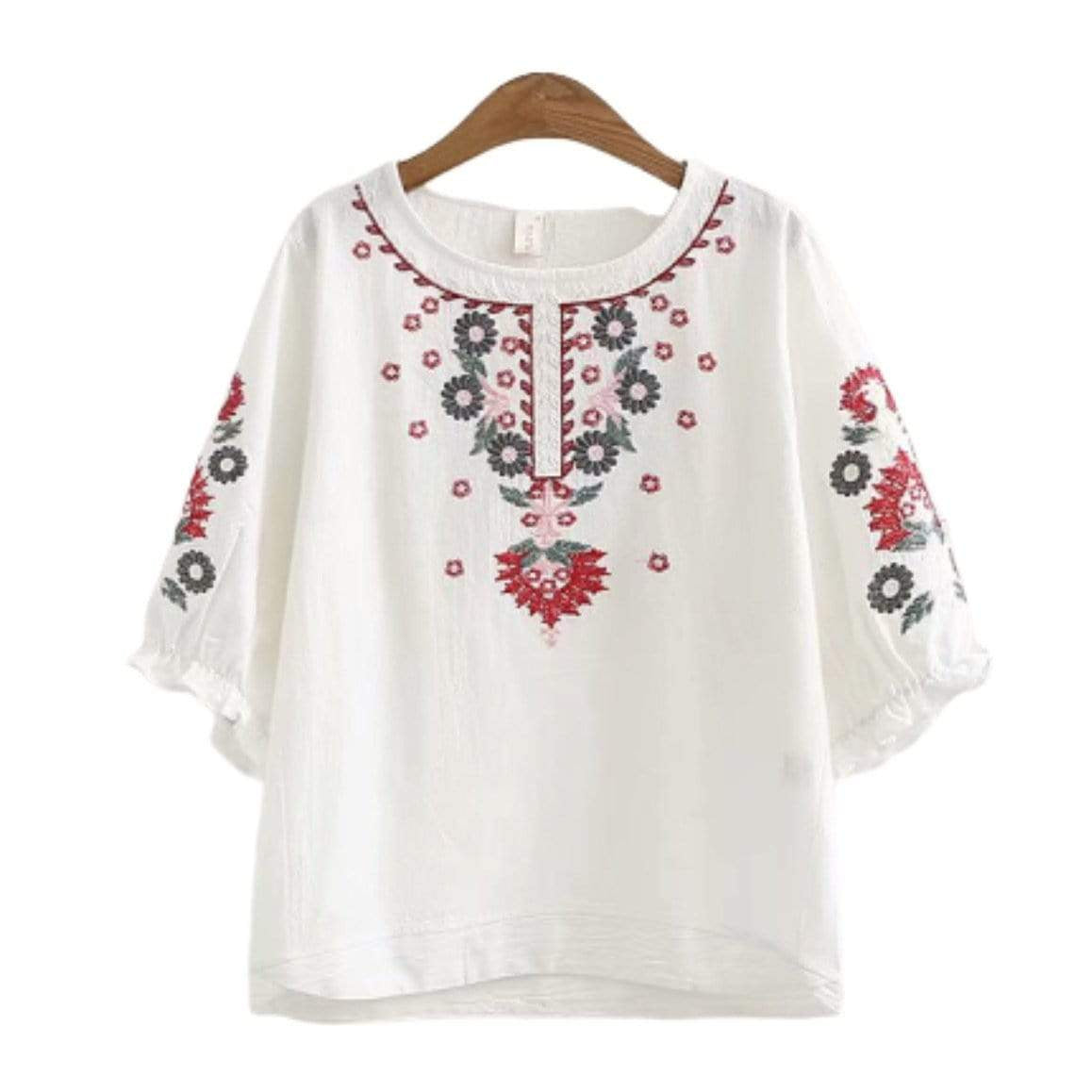 This American Indian style western blouse is made from cotton and linen, featuring intricate and vibrant embroidery. It is designed for women who appreciate country fashion.